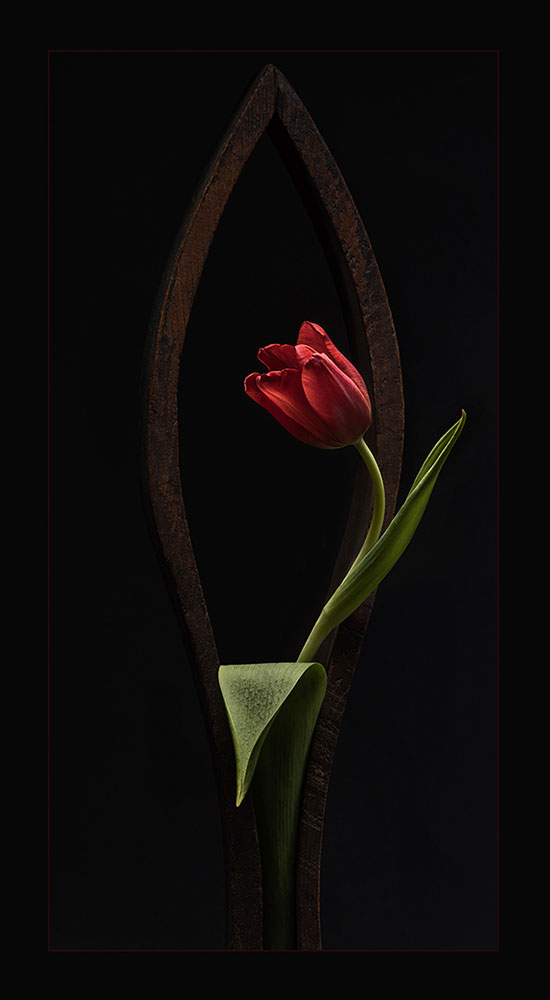 Using a grid, I illuminated the red tulip with a B10 Profoto strobe, equipped with a 1′ x 3′ foot strip light modifier and a grid, from above.  I used a folded strip of foam boad to give a bit of fill from camera right. This resulted in a captivating interplay of light and shadow on the petals.