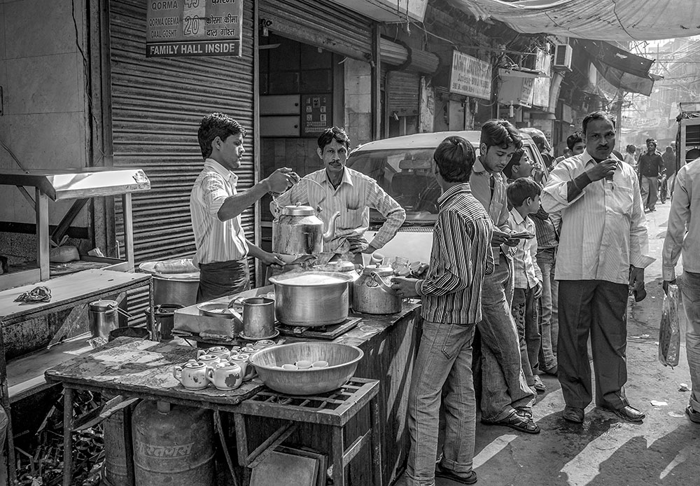 The final image is cropped slightly to tighten the focus. As anyone who has been to India knows, the country and its people are an explosion of color, but here in this image, color distracted from the story. Stripped to monochrome, the image distilled to its essentials: people, gesture, and light.