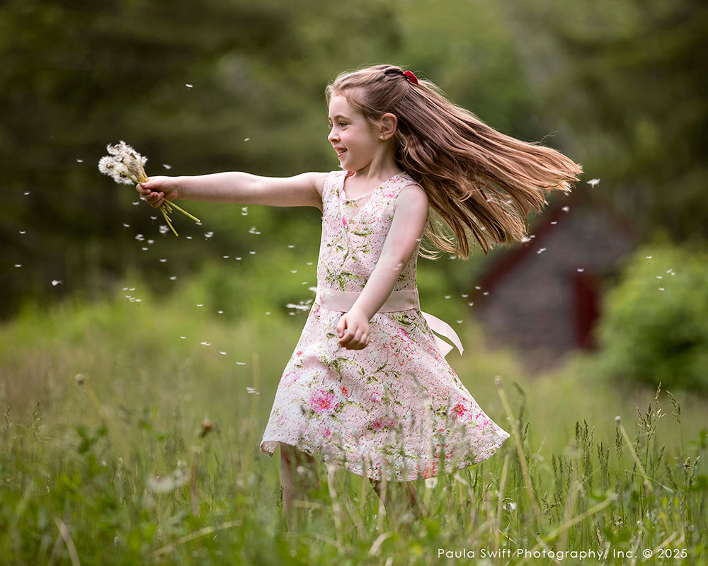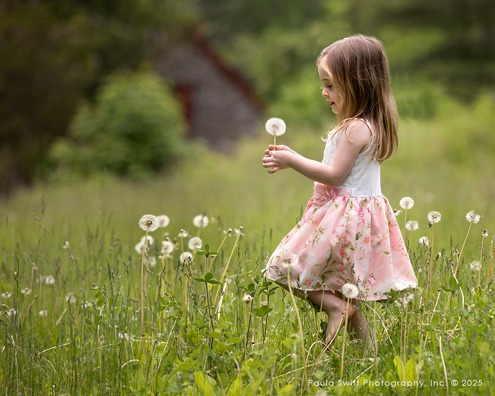 Before each session, I think about a story that fits the child’s age, personality, and location. A walk through a field, a wagon ride down a dirt path, or picking wildflowers and making wishes while blowing on a dandelion.