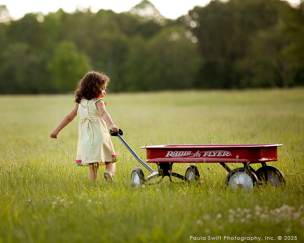 A red wagon isn’t just a cute detail, it can become a vehicle for adventure. A vintage suitcase gives a child a place to rest between prompts. A simple wooden crate can elevate a composition without feeling forced.